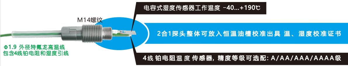 采用创新的 -RH 2合1温湿度探头,现场检验温湿箱布2合1温湿度传感器可减少现场布传感器重复布点工作量,提高现场检测效率,创新的2合1温湿度传感器较细的引线对检测高温箱时引线从门缝引出不会影响关门的密闭性,保障箱内高温气体不外泄,不会因箱门引线影响箱体内的温湿度场均匀度,2合1温湿度传感器能胜任190℃高温的环境检测温湿度,得以一次布好测点完成高低多温区校准,具有绿色节能计量的意义。