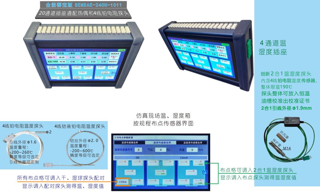 SENDAE-24CH-GS是在SENDAE-20CH-1101的基础上扩展干湿球测法的专用温湿度分析仪器,特别针对高温恒温湿箱校准检测而设计的超轻便式记录分析仪,主机适用规程集合JJF1101/JJG229/GBT517.5规程,以仿 真温湿箱和现场环境校准时传感器的布点位置设计操作界面,使现场校准检测结果一目了然,主机采用手机高清触摸屏,操控灵敏顺畅,内置10000mAh锂电池,8G内存,主机具编缉文档功能,相当于一台小型电脑。