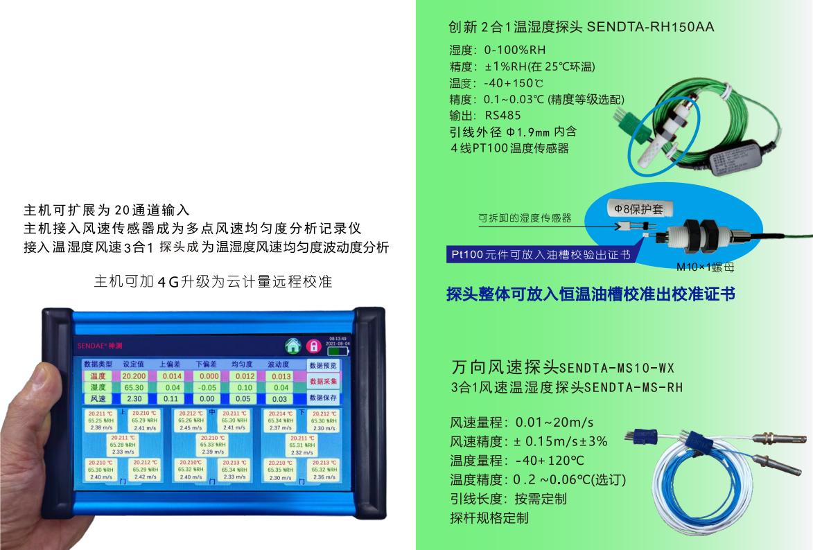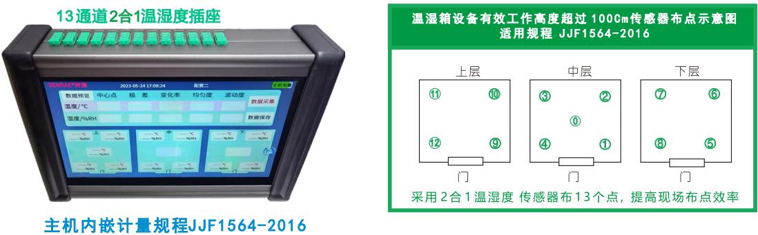 采用创新的SENDTA®-RH 2合1温湿度传感器得以诞生创新的13通道主机取代26通道旧模式,创新模式减少现场布传感器重复布点工作量,提高现场检测效率,创新的2合1温湿度传感器的较细引线对检测温湿箱时引线从门缝引出不会影响关门的密闭性,保障箱内的气体不外泄,不会因箱门引线影响箱体内的温湿度场均匀度。