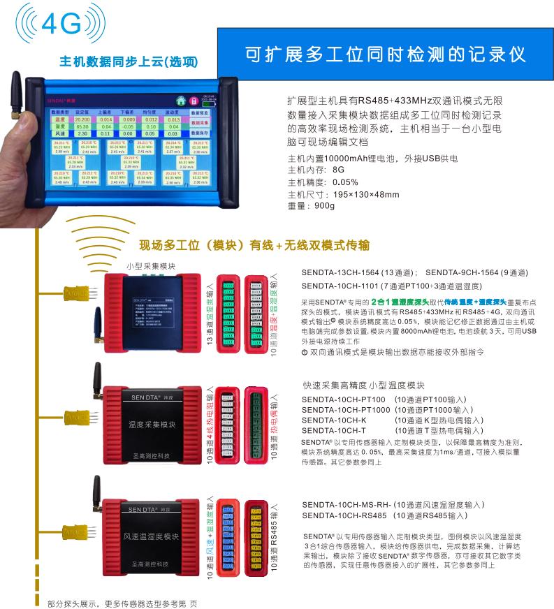 主机基本参数参考前面的7”触摸屏内容描述:1~400通道以内自设行列格数(通道数),可以理解为想一屏看多少通道就设多少通道,主机以接入 SENDTA的模块数据组成多通道记录分析仪,主机以接入模块的 SENDTA传感器为量程单位而定义主机的类型,比如模块接入的是温度传感器,则主机是温度记录分析仪,多个模块接入不同传感器则主机是一台综合参数测量记录分析仪,主机与模块之间数据传输以RS485+433MHz(4G)双模块双向通讯。