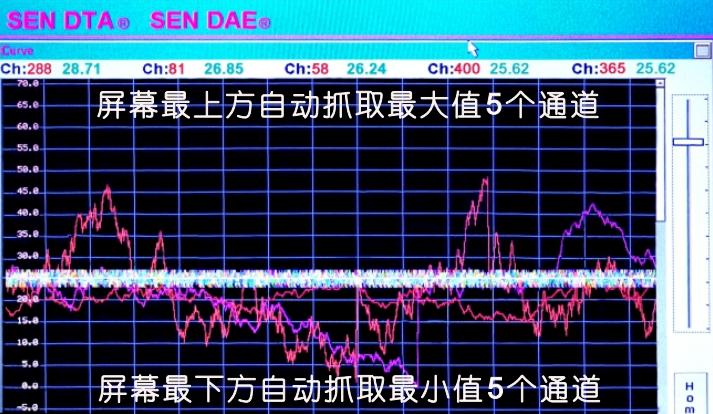 400通道曲线在一屏显示分析对比屏幕右侧滑块上下移动调整量程大小,以便查看超出量程的曲线,屏幕左上角的ch288是所有曲线中较大值通道编号,28.71是即时测得值屏幕左上角的ch365是曲线中第5大值通道值是25.62,屏幕下方抓取较小值5个通道。