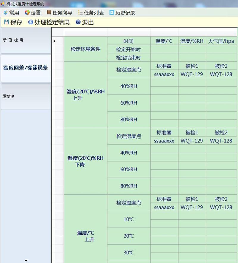 控制程序软件:检定人员输入检定信息后,程序自动控制设备升降温及升降湿,自动监控标准器变化,变化率达到要求后,自动采集标准及被检的数据像图,检定完成后自动关闭温湿度标准箱。待人员完成人工识别后,填写对应数据,按照相应的检定规程或校准规范自动进行数据处理,形成独立的记录表格及证书。